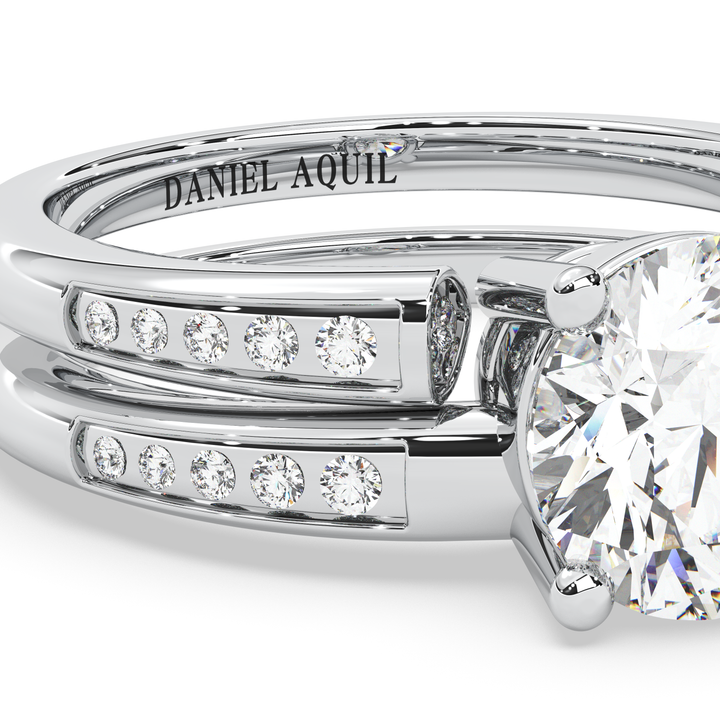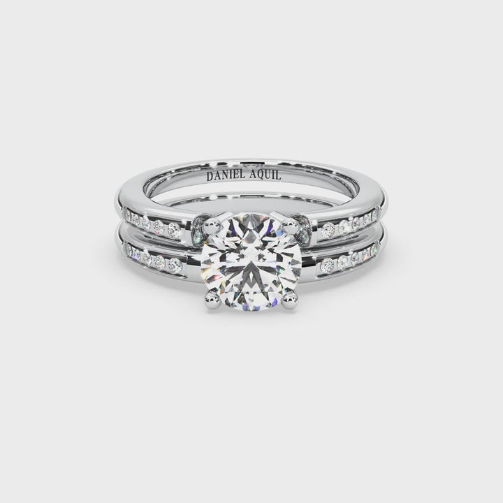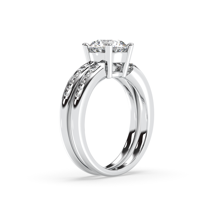 Crafted with timeless elegance, this white-dual band brings together a brilliant round-cut center stone and two perfectly aligned pavé bands, creating a harmonious balance of sparkle and sophistication. Designed with clean, modern lines, the silhouette reflects a sense of purity, commitment, and enduring beauty.At the heart of the design sits a luminous round solitaire, held securely in a classic four-prong setting that maximizes light reflection from every angle.