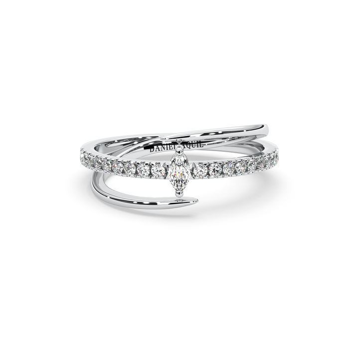 The central band is lined with precision-set round stones, forming a continuous ribbon of light that enhances the marquise centerpiece with a luxurious halo effect.