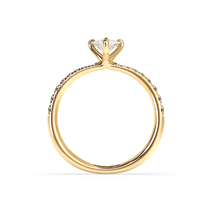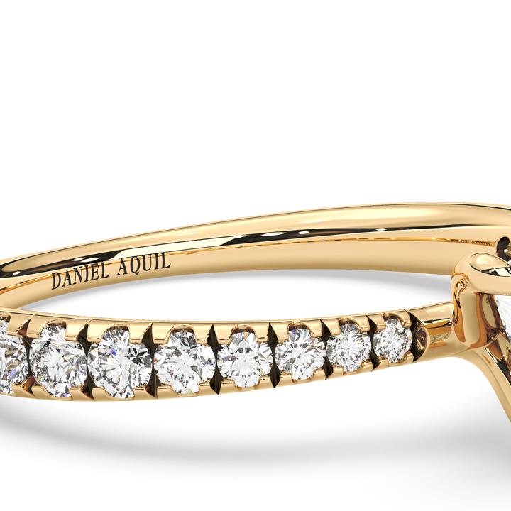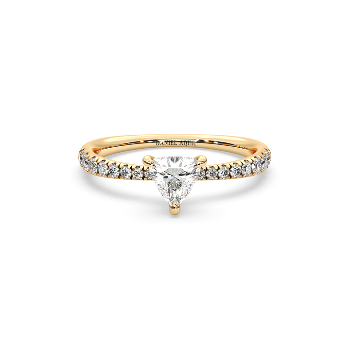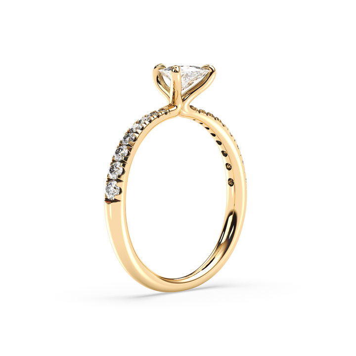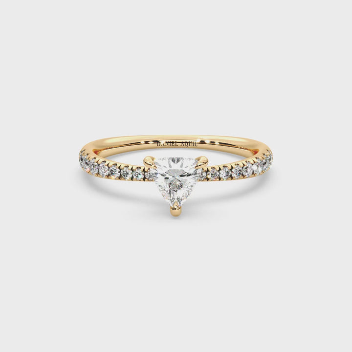This elegant ring features a dazzling trillion-cut zircon at its center a sophisticated triangular gemstone shape known in gemology for its brilliant sparkle and modern appeal. The center stone is beautifully set on a gold-tone silver band, adorned with shimmering pave-set zircon accents that enhance its luxurious shine.
